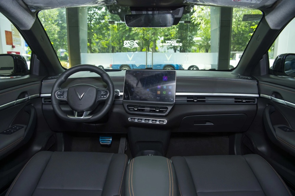 Vô-lăng 3 chấu được bọc da, thiết kế vô lăng của VF6 dạng vát đáy, trung tâm xe là màn hình kích thước lớn vừa để hiển thị thông tin vận hành.